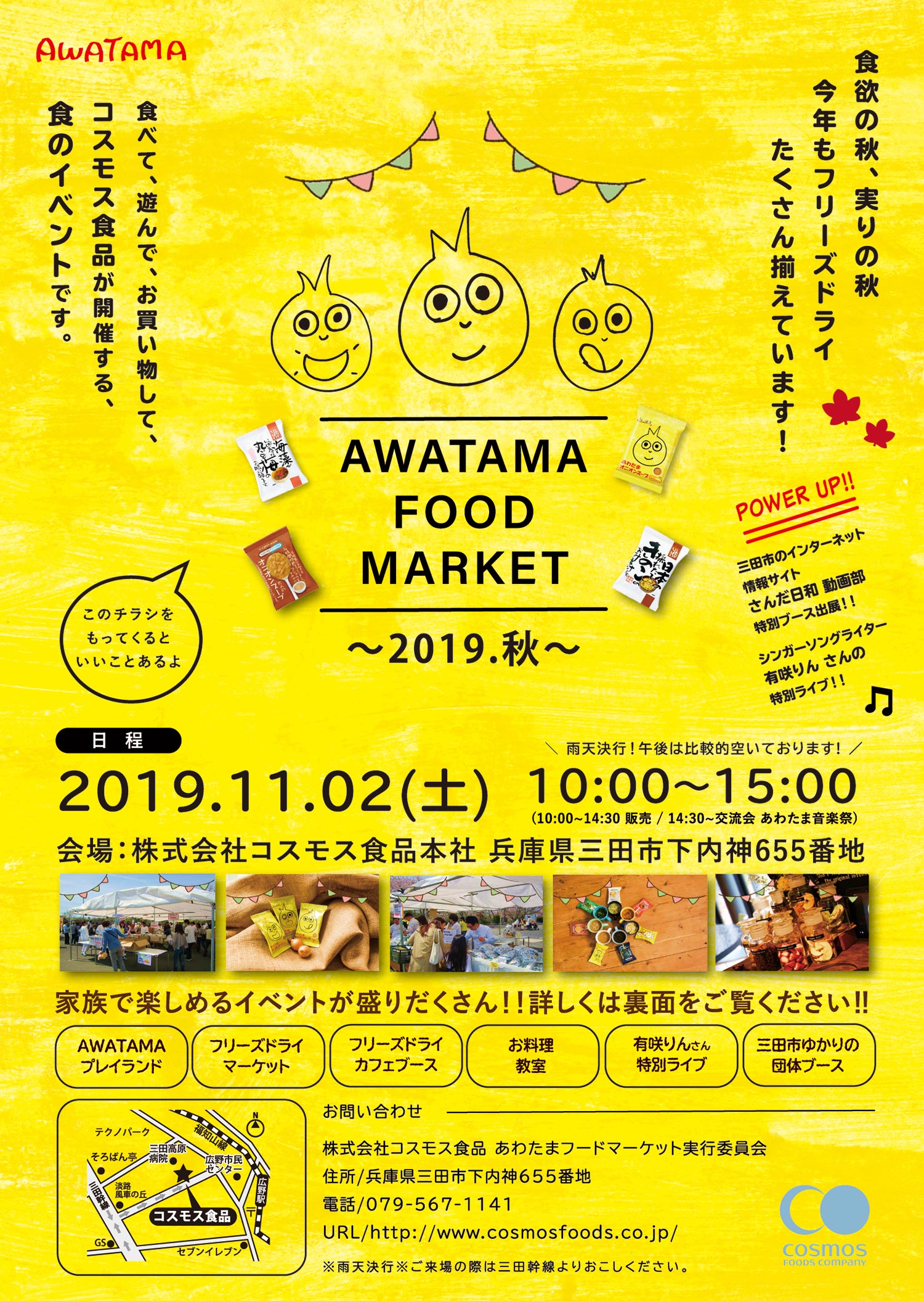 秋の気配が近づき、過ごしやすい陽気になってきた三田。秋は注目のイベントが目白押しですね。今回は、11月2日(土)に三田市広野の「コスモス食品」さんで開催予定の「AWATAMA FOOD MARKET 2019.秋」(あわたまフードマーケット)をご紹介します!