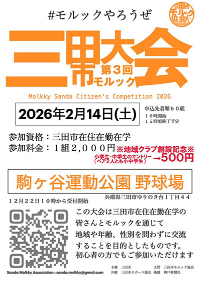 | 2月14日(土) | ![]() | 第3回 モルック三田市大会 時間:10:00~ 場所:駒ヶ谷運動公園 野球場(芝) 料金:1組 2,000円(2名ペア、小中学生ペアは500円) |
