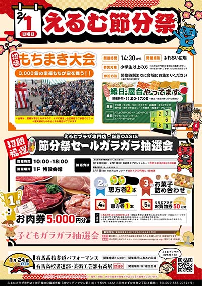 | 2月1日(日) | ![]() | えるむ節分祭 時間:【ガラガラ抽選会】10:00~18:00【縁日・屋台】11:00~17:00【もちまき大会】14:30~ 場所:えるむプラザ ふれあい広場、特設会場 料金:入場無料 |