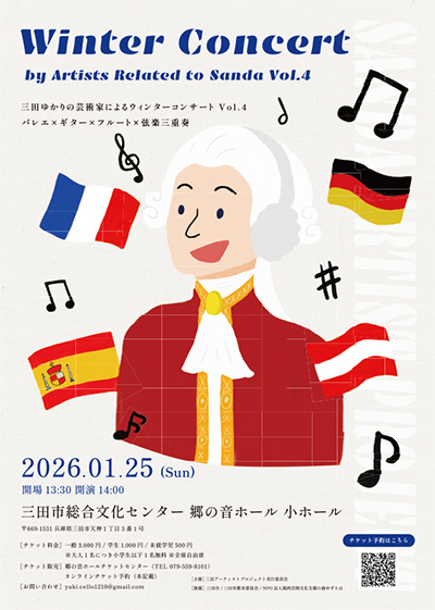 | 1月26日(日) | ![]() | 三田ゆかりの芸術家によるウィンターコンサート Vol.4 バレエ×ギター×フルート×弦楽三重奏 時間:【開場】13:30 【開演】14:00 場所:郷の音ホール 小ホール 料金:一般 3,000円 / 学生 1,000円 / 未就学児 500円 ※大人1名につき小学生以下1名無料 |