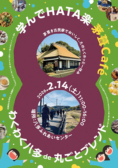 | 2月14日(土) | ![]() | 学んでHATA楽 茅葺Cafe 時間:11:00~16:00 場所:八多ふれあいセンター(神戸市北区八多町附物393-1) 料金:入場無料 |