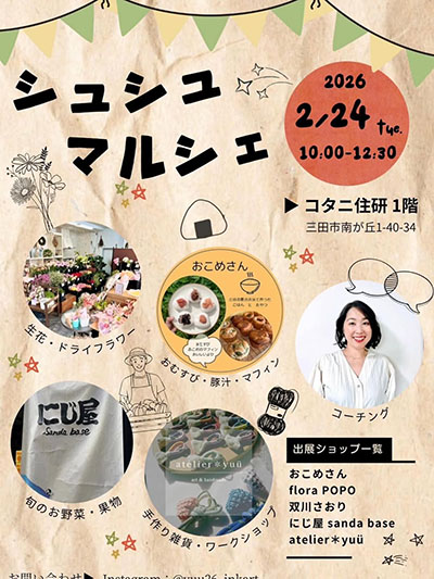 | 2月24日(火) | ![]() | シュシュマルシェ 時間:10:00~12:30 場所:コタニ住研 1階 料金:入場無料 |