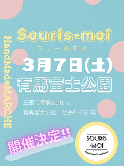 | 3月7日(土) | ![]() | Souris-moi(スリールモイ) 時間:10:00~16:00 場所:有馬富士公園 出合いの広場 料金:入場無料 |