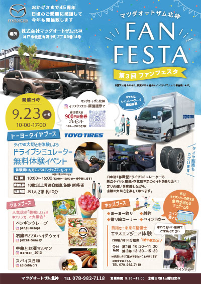 9月23日(火祝) | ![]() | マツダオートザム北神 第3回 ファンフェスタ 時間:10:00~17:00 場所:マツダオートザム北神(神戸市北区有野中町3丁目8番14号) 料金:入場無料 |