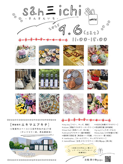 9月6日(土) | ![]() | さんさんいちマルシェ 時間:11:00~15:00 場所:エキマエアキチ 1階室内スペース(三田市弥生が丘1−8) 料金:入場無料 |