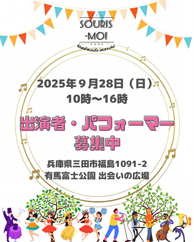 9月28日(日) | ![]() | Souris-moi.(スリールモイ) in 有馬富士公園 時間:10:00~16:00 場所:有馬富士公園 出合いの広場 料金:入場無料 |