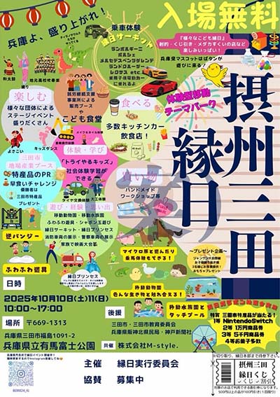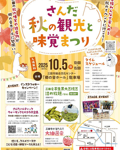 10月5日(日) | ![]() | 三田秋の観光と味覚まつり 2025 時間:10:00~15:00 場所:郷の音ホール 駐車場 料金:入場無料 |