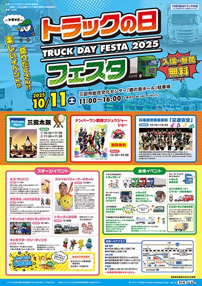 10月11日(土) | ![]() | トラックの日フェスタ 時間:11:00~16:00 場所:郷の音ホール 駐車場 料金:入場無料 |