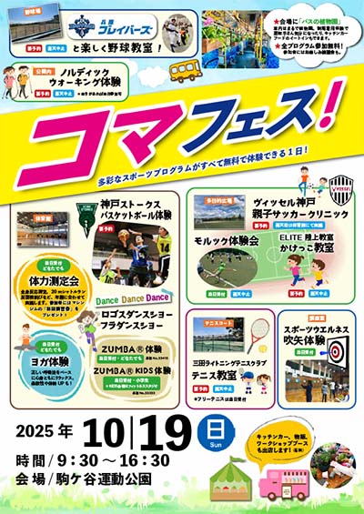 10月19日(日) | ![]() | コマフェス!2025 時間:9:30~16:30 場所:駒ヶ谷運動公園 料金:入場無料 |