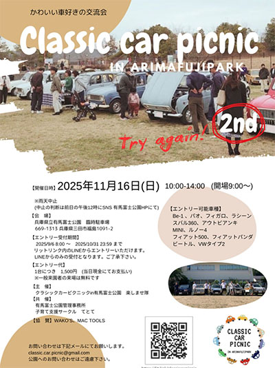11月16日(日) | ![]() | クラシックカーピクニック in 有馬富士公園 2nd 時間:10:00~14:00 (開場9:00〜) 場所:有馬富士公園 臨時駐車場 料金:入場無料 (エントリー1台1,500円) |
