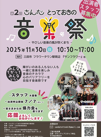 11月30日(日) | ![]() | 第2回 さんだとっておきの音楽祭 時間:10:00~17:00 場所:フラワータウン駅周辺、サンフラワー、ほか 料金:入場無料 |