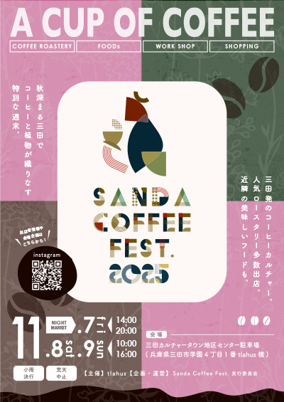 11月7日(金)・8日(土)・9日(日) | ![]() | Sanda Coffee Fest. 2025 (三田コーヒーフェス) 時間:【7日】14:00~20:00【8日・9日】10:00~16:00 場所:三田カルチャータウン地区センター駐車場(三田市学園4丁目1番 tlahus横) 料金:入場無料 |