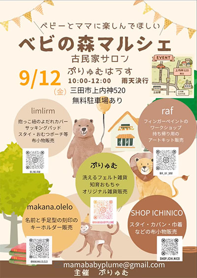 9月12日(金) | ![]() | ベビの森マルシェ 時間:10:00~12:00 場所:古民家サロン ぷりゅむはうす(三田市上内神520) 料金:入場無料 |