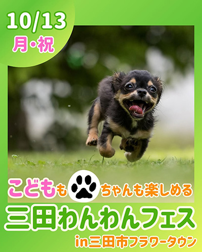 10月13日(月祝) | ![]() | 三田わんわんフェス 時間:10:00~16:00 場所:エキマエアキチ 料金:入場無料 |