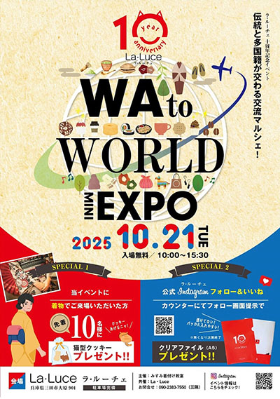 10月21日(火) | ![]() | WA to WORLD mini EXPO 時間:10:00~15:30 場所:La・Luce(三田市大原901) 料金:入場無料 |