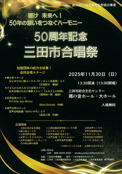 11月30日(日) | ![]() | 50周年記念 三田市合唱祭 時間:【開場】13:00 【開演】13:30 場所:郷の音ホール 大ホール 料金:入場無料 |