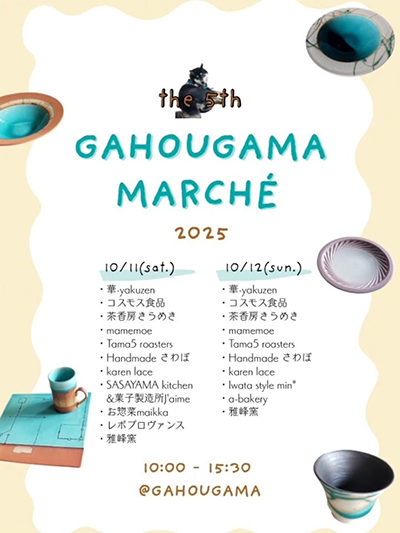 10月11日(土)・12日(日) | ![]() | 雅峰窯マルシェ 2025 時間:11:00~15:30 場所:雅峰窯(丹波篠山市今田町上立杭355) 料金:入場無料 |