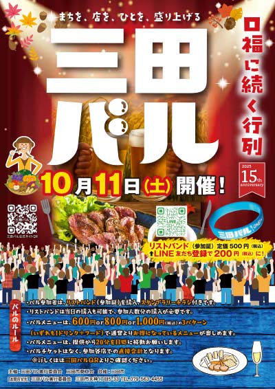 10月11日(土) | ![]() | 三田バル 2025 時間:参加店舗により異なる 場所:三田駅前周辺の三田バル参加店 料金:リストバンド(参加証)500円→LINE友だち登録で200円 |