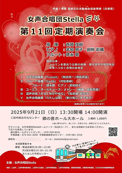 9月21日(日) | ![]() | 女声合唱団 Stella 第11回定期演奏会 時間:【開場】13:30 【開演】14:00 場所:郷の音ホール 大ホール 料金:1,000円 |
