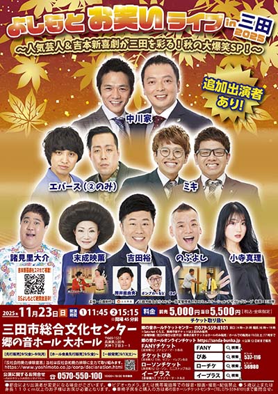 11月23日(日) | ![]() | よしもとお笑いライブ in 三田2025 ~人気芸人&吉本新喜劇が三田を彩る!秋の大爆笑SP!~ 時間:①11:45~ ②15:15~ (開場45分前) 場所:郷の音ホール 大ホール 料金:友の会4,500円(前売) / 一般 5,000円(前売) / 当日 5,500円 ※5歳以上または身長110cm以上のお子様はお席が必要となります |