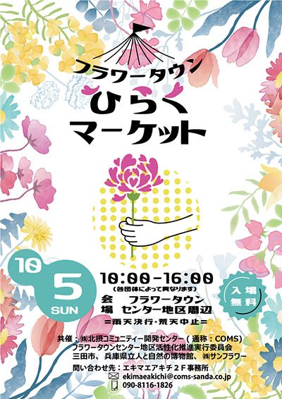 10月5日(日) | ![]() | 第4回 フラワータウン ひらくマーケット 時間:10:00~16:00 場所:フラワータウン センター地区周辺 料金:入場無料 |