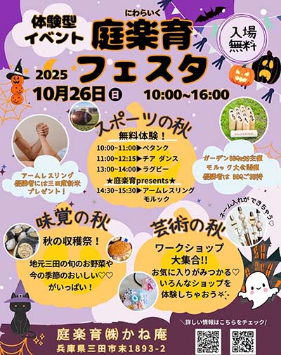 10月26日(日) | ![]() | 庭楽育フェスタ 2025 時間:10:00~16:00 場所:庭楽育(株)かね庵 料金:入場無料 |