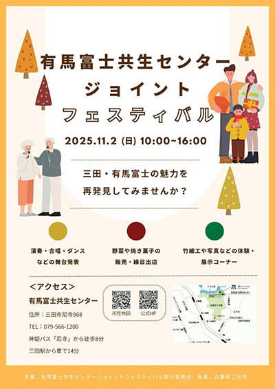 11月2日(日) | ![]() | 有馬富士共生センター ジョイントフェスティバル 時間:10:00~16:00 場所:有馬富士共生センター 料金:入場無料 |