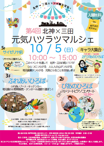 10月5日(日) | ![]() | 第4回 北神×三田 元気ハツラツマルシェ 時間:10:00~15:00 場所:エコール・リラ ショッピングセンター 料金:入場無料 |