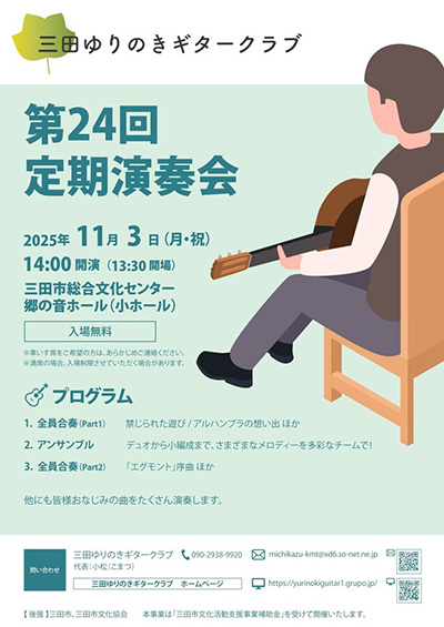 11月3日(月祝) | ![]() | 三田ゆりのきギタークラブ 第24回定期演奏会 時間:【開場】13:30 【開演】14:00 場所:郷の音ホール 小ホール 料金:入場無料 |