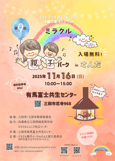 11月16日(日) | ![]() | 第9回 ミラクル親子パーク in さんだ 時間:10:00~15:00 場所:有馬富士共生センター 料金:入場無料 |