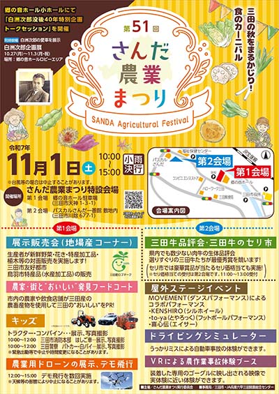 11月1日(土) | ![]() | 第51回 さんだ農業まつり 時間:10:00~15:00 場所:さんだ農業まつり特設会場(郷の音ホール駐車場、パスカルさんだ一番館敷地内) 料金:入場無料 |