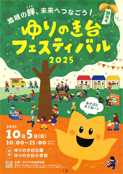 10月5日(日) | ![]() | ゆりのき台フェスティバル 2025 時間:10:00~15:00 場所:ゆりのき台公園、ゆりのき台小学校 料金:入場無料 |