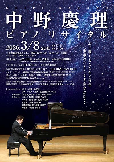 | 3月8日(日) | 中野慶理 ピアノリサイタル 時間:【開場】13:15 【開演】14:00 場所:郷の音ホール 大ホール 料金:一般 2,500円 / 友の会 2,200円 / 高校生以下 1,000円 ※未就学児入場不可 | |