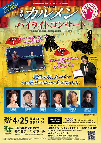 | 4月25日(土) | オペラハイライトコンサート G.ビゼー作曲 歌劇「カルメン」 時間:【開場】14:30 【開演】15:00 場所:郷の音ホール 小ホール 料金:1,000円(一般・Sato-Netくらぶ共) ※未就学児入場不可 | |