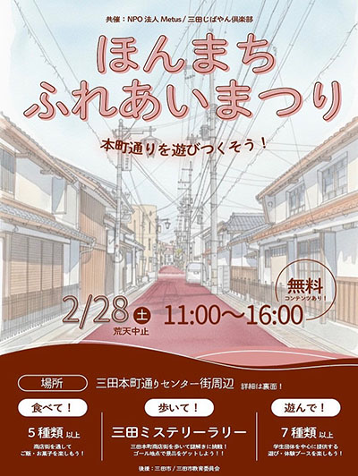 | 2月28日(土) | ![]() | ほんまちふれあいまつり 時間:11:00~16:00 場所:三田本町通りセンター街周辺 料金:参加無料 |