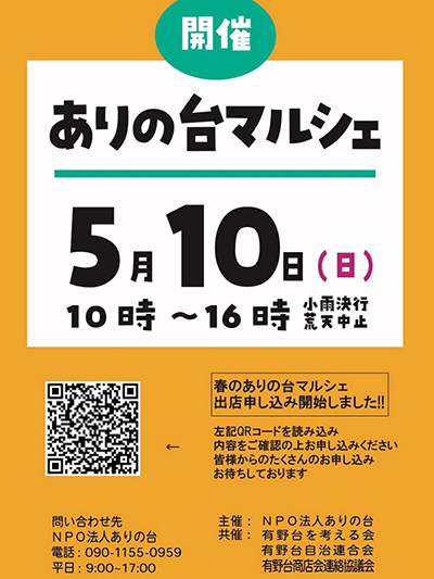 | 5月10日(日) | ![]() | ありの台マルシェ 時間:10:00~16:00 場所:有野台商店街、有野公園 料金:入場無料 |