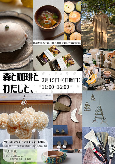 | 3月15日(日) | 森と珈琲とわたしと、 時間:11:00~16:00 場所:神戸三田アウトドアビレッジTEMIL 料金:入場無料 | |