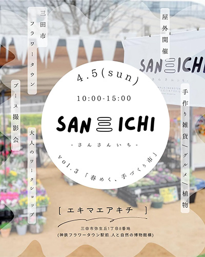 | 4月5日(日) | SAN 三 ICHI 時間:10:00~15:00 場所:エキマエアキチ 料金:入場無料 | |