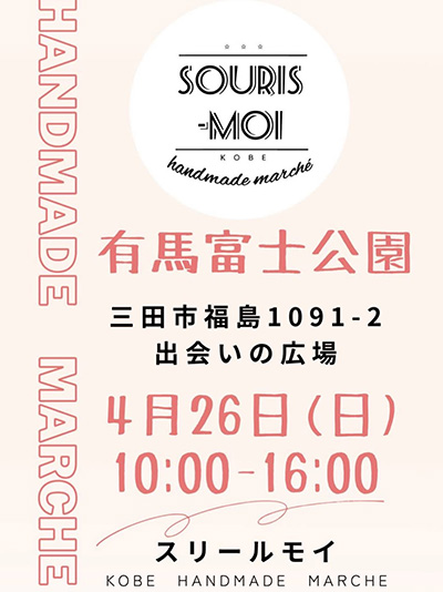 | 4月26日(日) | SOURIS−MOI(スリールモイ) 時間:10:00~16:00 場所:有馬富士公園 出合いの広場 料金:入場無料 | |