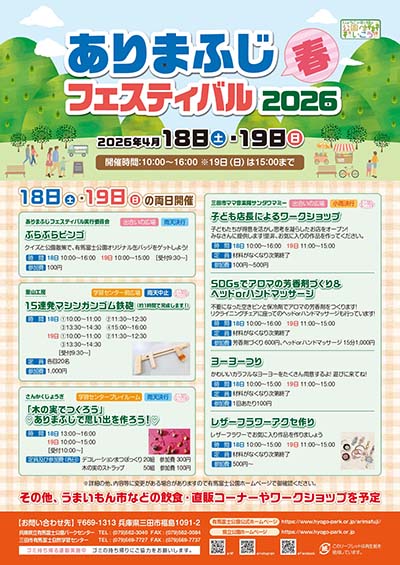 | 4月18日(土)・19日(日) | ありまふじフェスティバル 2026 春 時間:【18日】10:00〜16:00【19日】10:00〜15:00 場所:有馬富士公園「出合いのゾーン」、有馬富士自然学習センター 料金:入場無料 | |