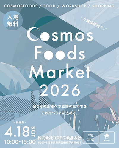 | 4月18日(土) | Cosmos Foods Market 2026 時間:10:00~15:00 場所:株式会社コスモス食品 本社(三田市下内神655番地) 料金:入場無料 | |
