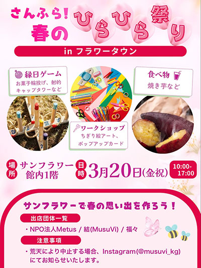 | 3月20日(金祝) | ![]() | さんふら!春のひらひら祭り 時間:10:00~17:00 場所:サンフラワー館内1階 料金:入場無料 |