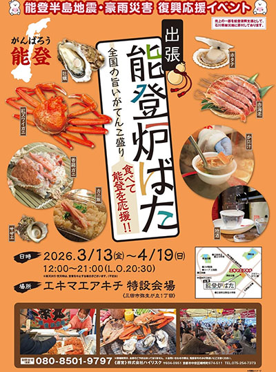 | 3月13日(金)〜4月19日(日) | 出張 能登炉ばた 時間:12:00~21:00 (L.O.20:30) 場所:エキマエアキチ 料金:入場無料 | |