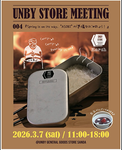 | 3月7日(土) | ![]() | UNBY STORE MEETING 時間:11:00~18:30 場所:UNBY GENERAL GOODS STORE 三田店 料金:入場無料 |