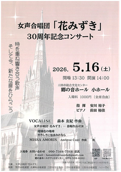 | 5月16日(土) | ![]() | 女声合唱団「花みずき」30周年記念コンサート 時間:【開場】13:30 【開演】14:00 場所:郷の音ホール 小ホール 料金:1,000円(全席自由) |