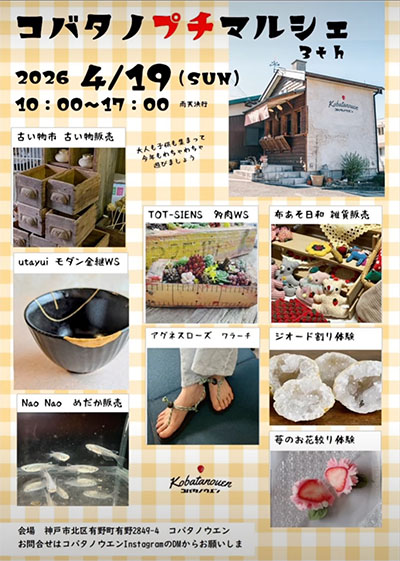 | 4月19日(日) | ![]() | コバタノプチマルシェ 時間:10:00〜17:00 場所:コバタノウエン(神戸市北区有野町有野2849-4) 料金:入場無料 |