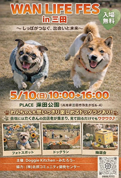 | 5月10日(日) | ![]() | WAN LIFE FES in 三田 時間:10:00〜16:00 場所:深田公園(三田市弥生が丘6-4) 料金:入場無料 |