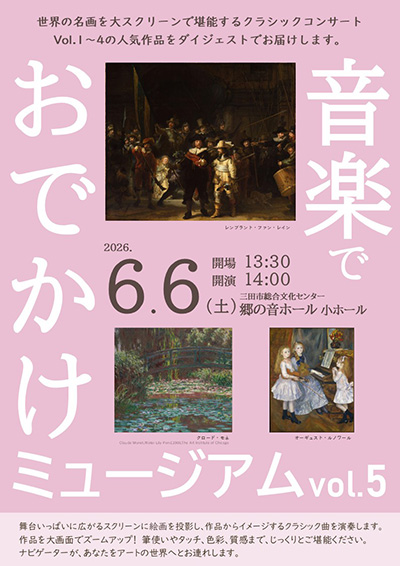 | 6月6日(土) | 音楽でおでかけミュージアム vol.5 時間:【開場】13:30 【開演】14:00 場所:郷の音ホール 小ホール 料金:一般 2,700円 / 友の会 2,400円 / 大学生以下 1,000円 ※未就学児入場不可 | |