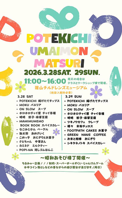 | 3月28日(土)・29日(日) | ![]() | ポテキチのうまいもん祭り 時間:10:00~16:00 場所:篠山チルドレンズミュージアム 料金:施設入館料が必要 |