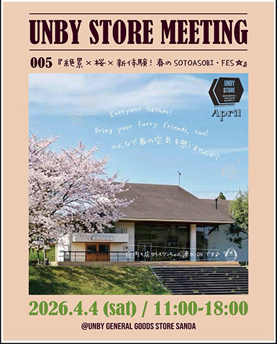 | 4月4日(土) | UNBY STORE MEETING 005 時間:11:00~18:00 場所:UNBY GENERAL GOODS STORE SANDA 料金:入場無料 | |